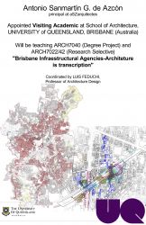 Will be teaching ARCH7040 (Degree Project) and ARCH7022/42 (Research Selective). "Brisbane Infraestructural Agencies-Architeture is transcription"