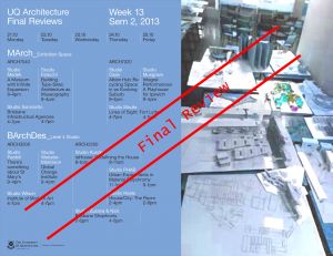 Next week's Final Review for UQ's Final Year Studio Sanmartín in the Zelman Cowen Building L3 Exhibition Space.